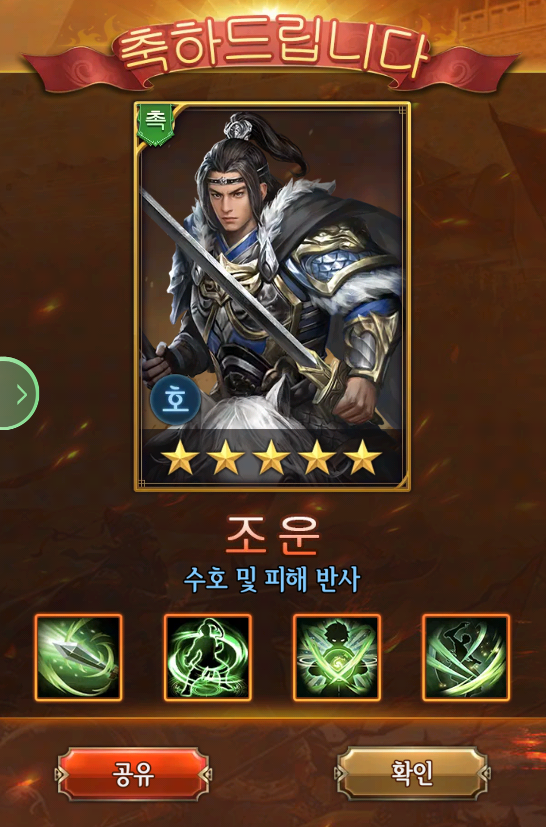 2. 좀만 즐기시다 보면 5성 [조운]을 수령 가능합니다. 15장 통과하면 수령 가능한데요, 현재 저는 탱커로 잘 사용하고 있답니다!!